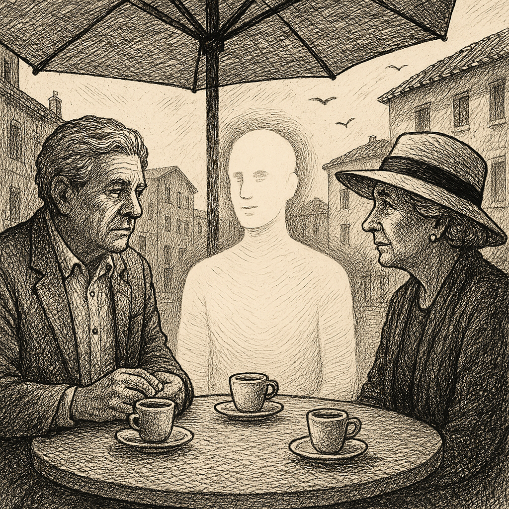 On the corner of an old square, there was a terrace with sunshades already worn out by the wind. The waiter served short espressos with a distracted air, as if he were the last guardian of universal order. At the table in the corner, two men discussed the future. One seemed made of flesh, the other of light.