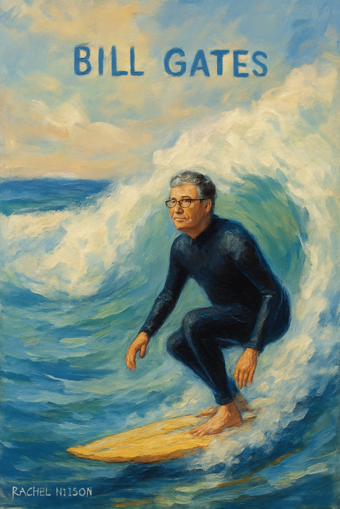 A symbolic painting, Rachel Nelson–inspired: Bill Gates on a surfboard, in quiet contemplation